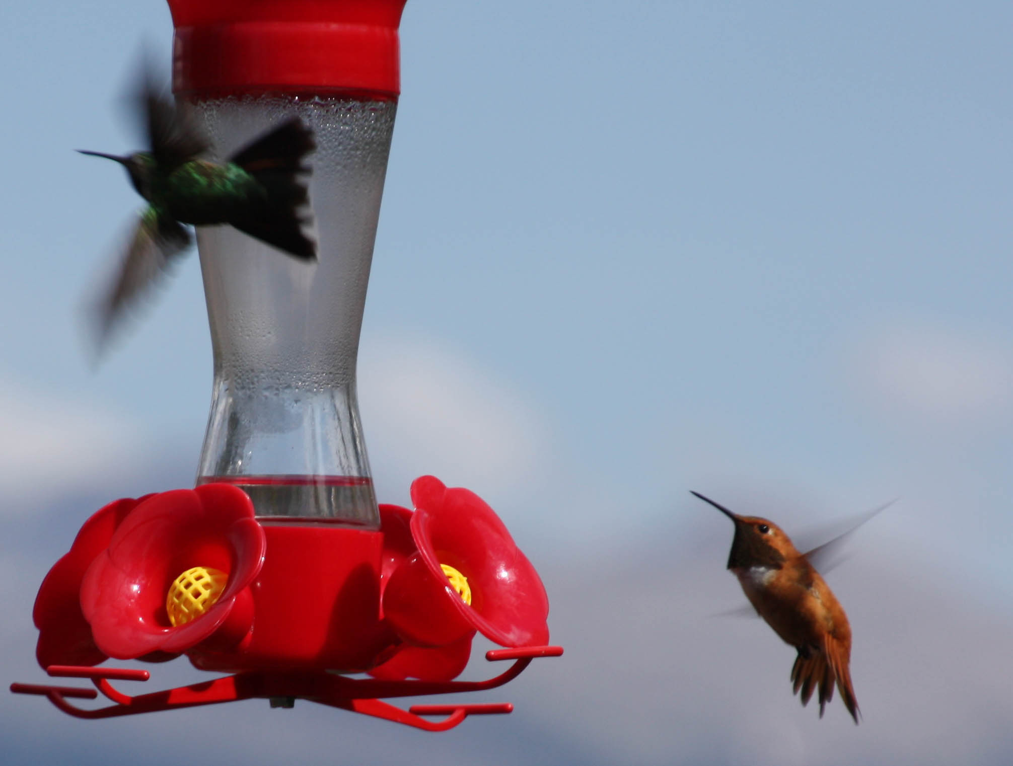 Two hummingbirds fight over a feeder on our deck near Lake Granby